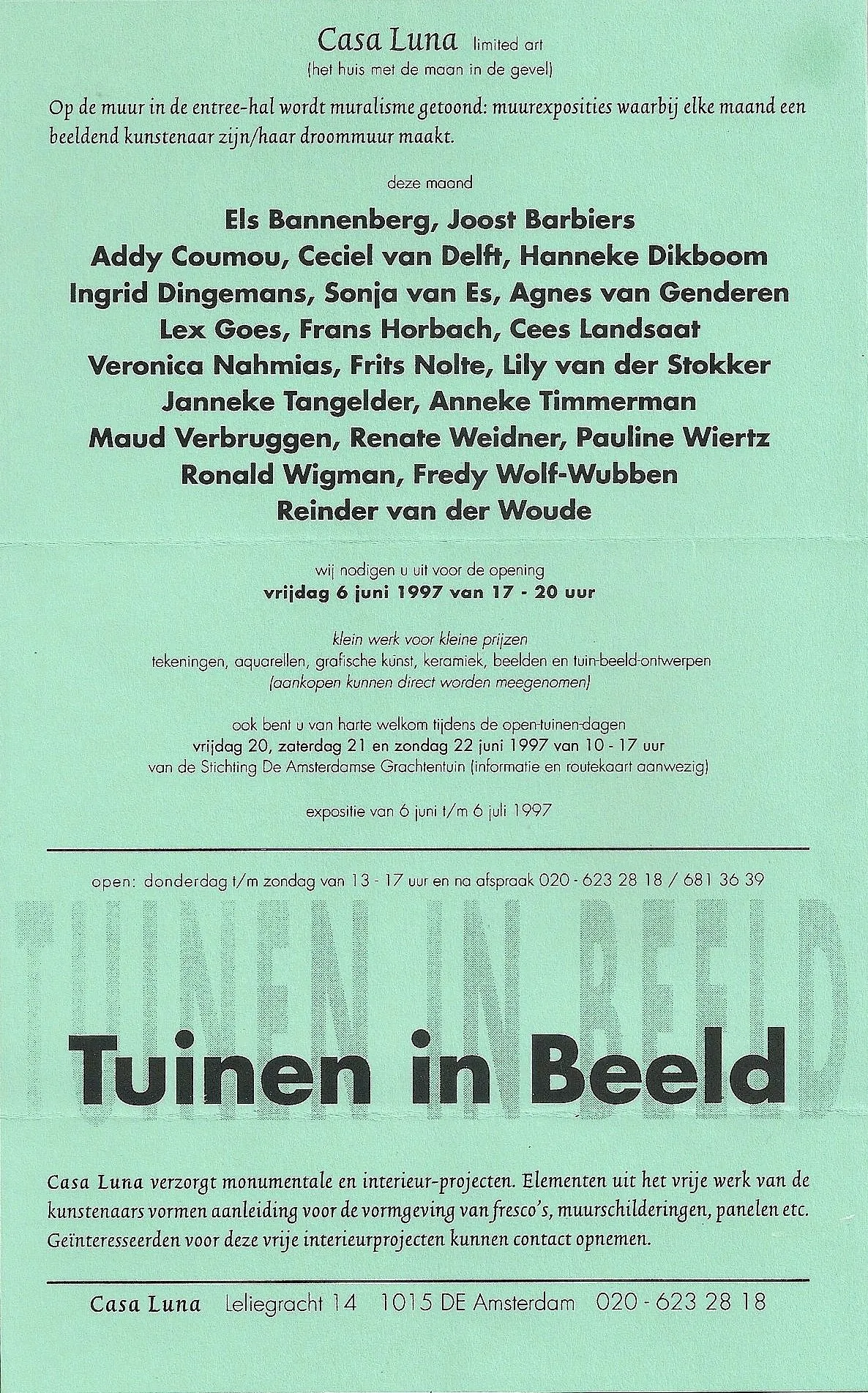 toonde ik samen met Maud Verbruggen in de jaren 90 in de entreehal muralisme: muurexposities waarbij elke maand een kunstenaar zijn of haar droommuur maakte. En tweemaal per jaar organiseerden we verkoopexposities onder de naam Casa Luna limited art. Zoals Tuinen in Beeld, een jaarlijkse tentoonstelling in samenwerking met de Stichting Open Tuinendagen.