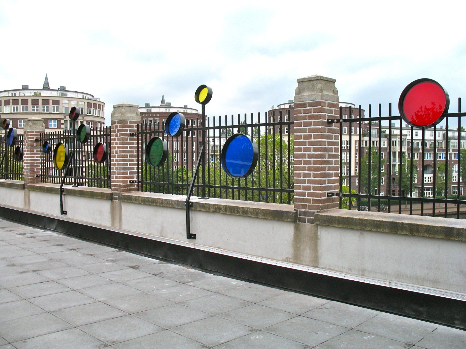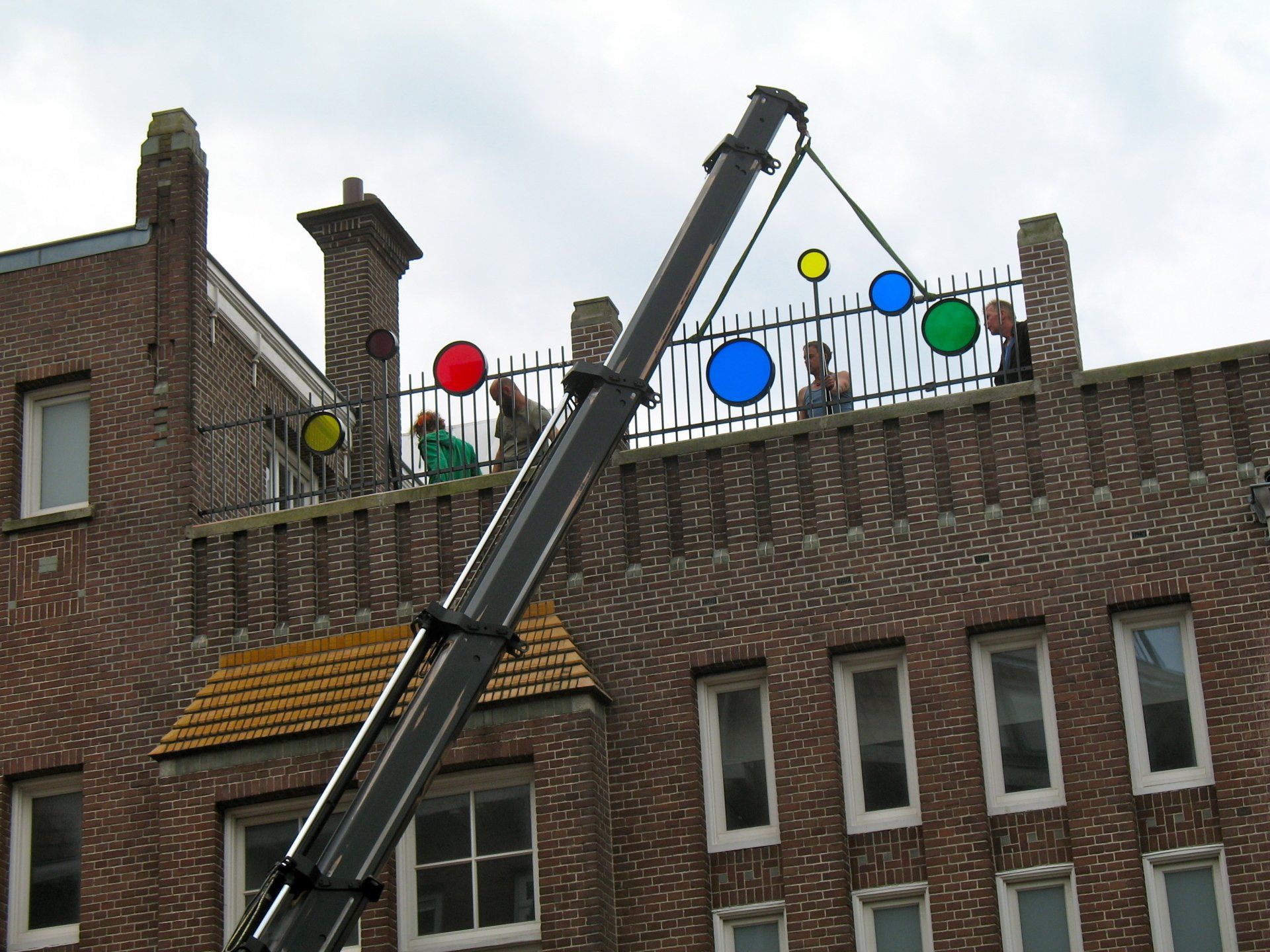 Glaskunstwerk KROON ontwierp ik in 2017. Het staat op de voorgevel van basisschool De Catamaran in Amsterdam-West. Het is het hek langs de dakspeelplaats op de 2e verdieping en vormt één geheel met de gerestaureerde gevel. Het bestaat uit 19 gekleurde iets gekantelde ronde glazen in een klassiek spijlenhekwerk.