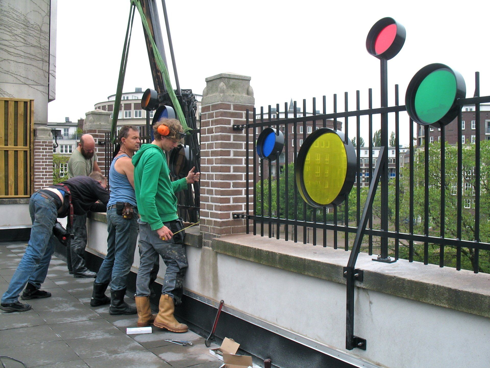 Ontwikkeld i.s.m. het ontwerpteam van school, architect, projectleider en de afdeling Kunst en Cultuur van het stadsdeel. Uitgevoerd door Van Tetterode Glass Studio en bouwatelier Fiction Factory. Architect Henri Rots.