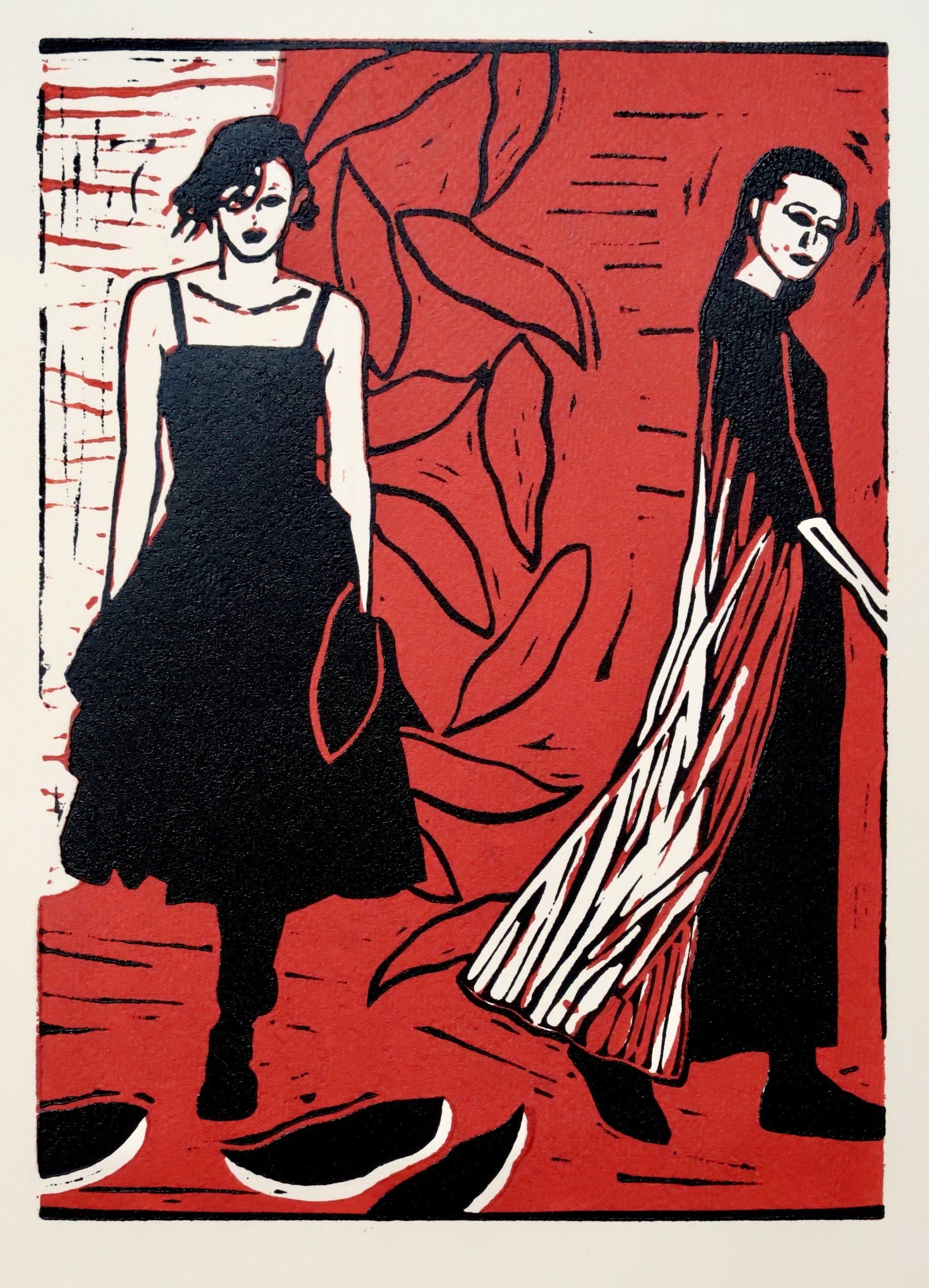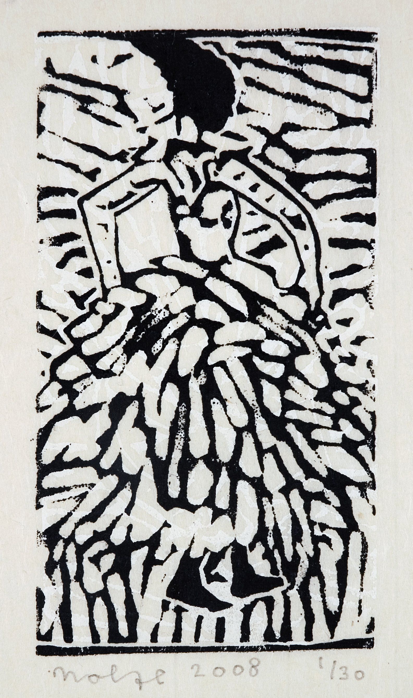 (...) 'Het met de guts snijden in linoleum is vergelijkbaar met hakken beeldhouwer: wat je weghaalt is definitief. Dan voor het drukken de kleuren bepalen, het is allemaal een heel boeiend proces. Het is een manier van werken waarin heel mijn wezen zit.' Dat hij in dit triptiek de vrouw de hoofdrol toebedeeld is doelbewust. 'Voor mij vertegenwoordigt zij zo de mens als geheel.' "